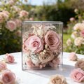 この作品は「庭」と名付けられています。誰もが心の中に小さな庭を持っています。小さくても、一目見ればいつも美しさに満ちています。サイズは約10×10×10cm。高級感のある透明ギフトボックス入りなので、どなたにも安心してお贈りいただけます。箱は花を埃や湿気から守り、より長く楽しめます。この作品は3種類のデザインからお選びいただけます。あらゆる機会や相手にぴったりの贈り物です。