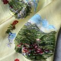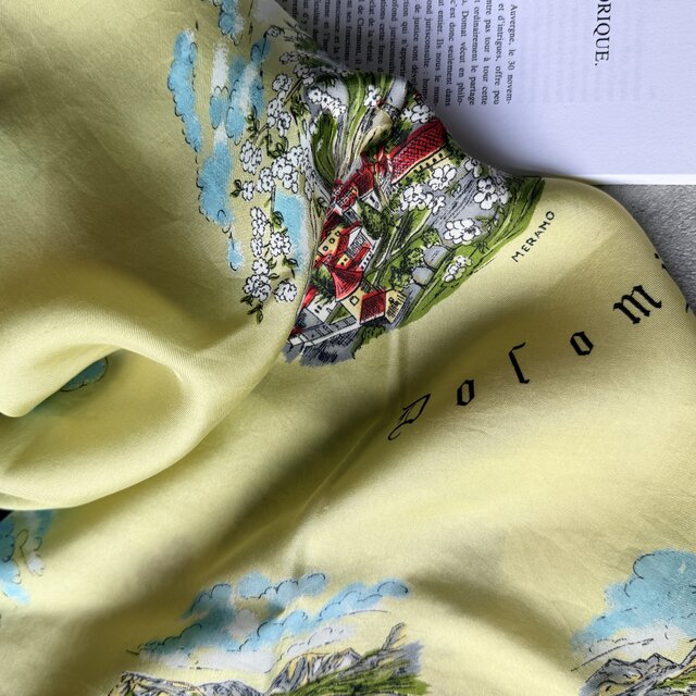 イタリアの観光地ドロミテを描くレトロなプリント。柔らかなイエローベースに、カラフルに街とフローラルが描かれ、レトロな雰囲気たっぷりです。