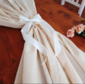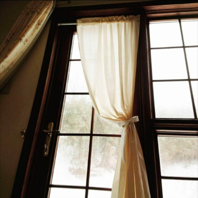 ♥️アンティーク風のナチュラルコットン生地(生成り)に、共布のフリルとサテンリボン付きクリップをあしらった、片開きカフェカーテンを製作しました。