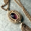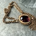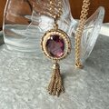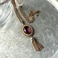 アメジストカラーのカットグラスとタッセルが印象的なゴールドトーンペンダントネックレス。