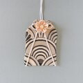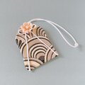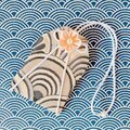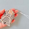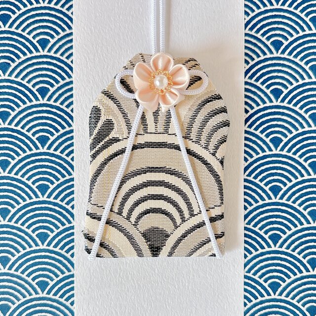 白黒の波模様に白紐・白い花を合わせた手作りのお守り袋です