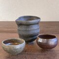 このセットは、3色(窯変グレー、鉄赤、窯変栗色)で組んでいます。窯に入れる位置や焼き加減により、異なる発色をした器どうしが、互いに響き合う3点です。