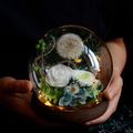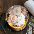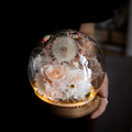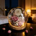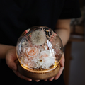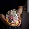サイズは約13×13×11cm。光の効果を持つ豪華なガラスカバーが付属しているので、光を灯すと温かみが加わり、贈り物にぴったりです。ガラスカバーは埃や湿気から守り、花をより長く楽しめます。