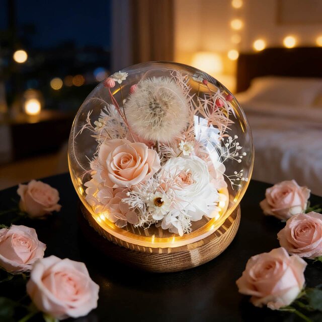 サイズは約13×13×11cm。光の効果を持つ豪華なガラスカバーが付属しているので、光を灯すと温かみが加わり、贈り物にぴったりです。ガラスカバーは埃や湿気から守り、花をより長く楽しめます。