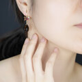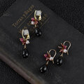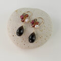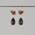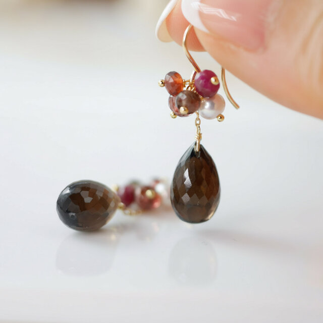 ドロップブリオレットカットのスモーキークォーツにグレーパール・ルビー・ロードライトガーネット・ガーネット・スモーキークォーツを合わせたブーケピアス