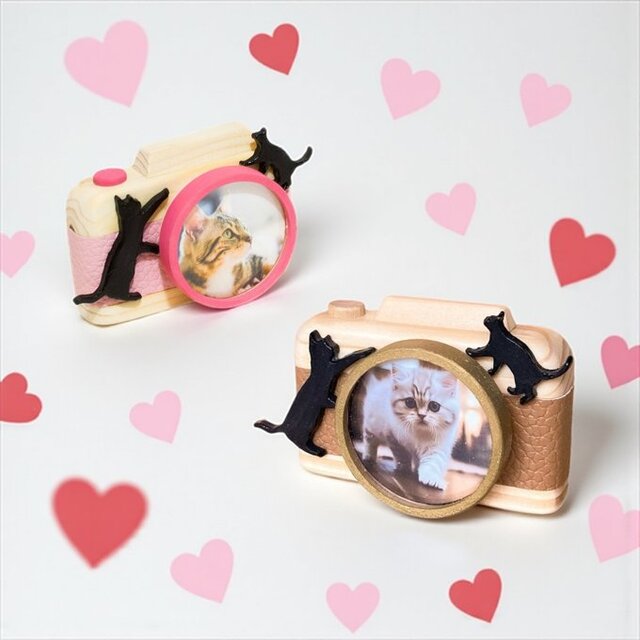 猫とカメラのミニフォトフレーム|選べる2カラー〈ピンク/ベージュ〉写真印刷・ギフト対応