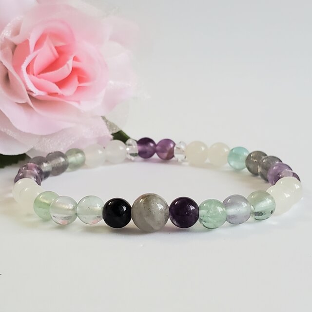 柔らかな透明感が綺麗なラブラドライトに心を癒すフローライトと優しい輝きのムーンストーンを合わせたブレスレット。穏やかな光を放つ淡い色合いが心を静かに整え前向きな気持ちへと導いてくれます。
