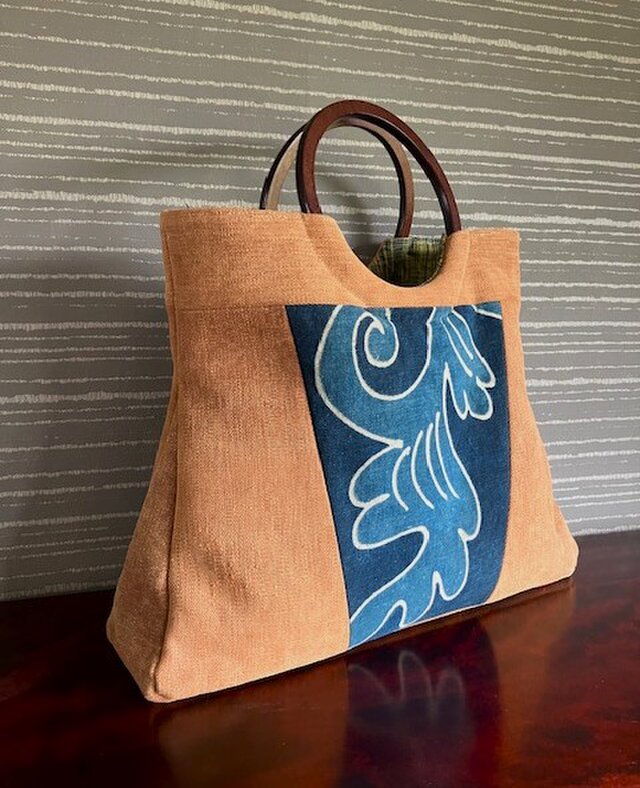 大胆な唐草模様の筒描きのインパクトは、道行く人の目をひく手提げになったと思います。