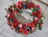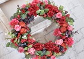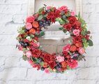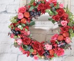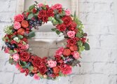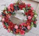 赤いバラの深い色合いと ピンクのバラをたくさんアレンジしたリース