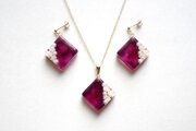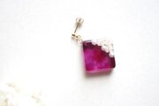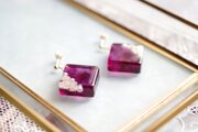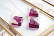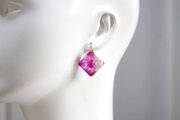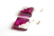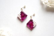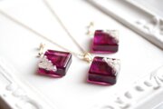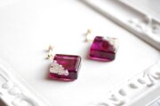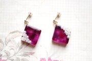 パールとお花をスクエア型のレジンに封じ込め、ピンクと紫で着色したピアス。