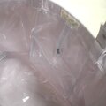 A bag in which the fabric is sandwiched by transparent vinyl (PVC) and sewed with a sewing machine.