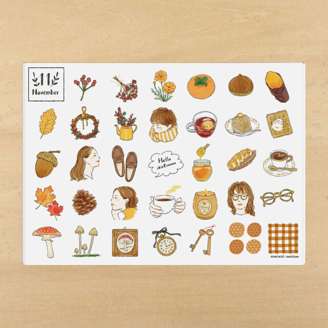 11月の季節のモチーフ31種類が詰まったマスキングシート(弱粘着シール)です。
