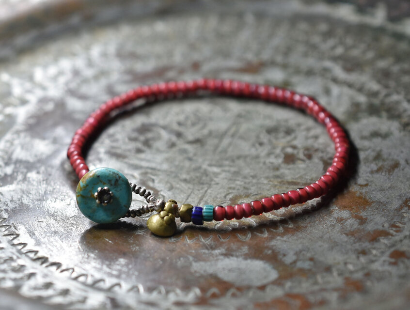 素材:ガラス、oldオリッサブラス、ロウビキ紐、カレンシルバー、シルバー、ターコイズ