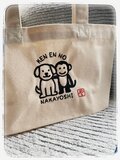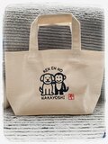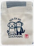 犬と猿が肩を組み、「犬猿の仲よし」とローマ字で刺繍されたトートバッグ。