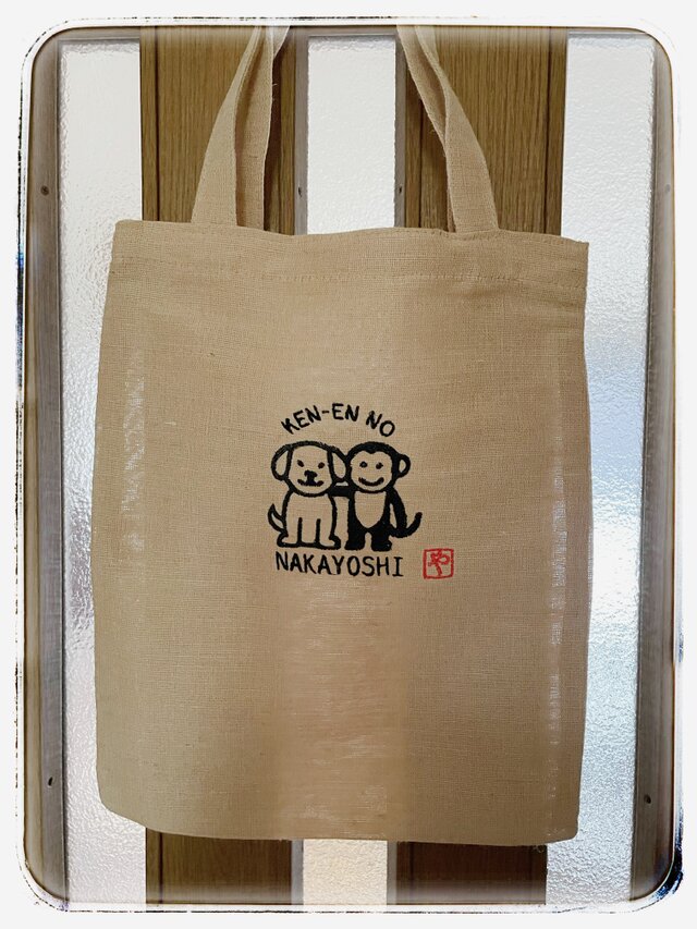 犬と猿が肩を組み、「犬猿の仲よし」とローマ字で刺繍されたトートバッグ。