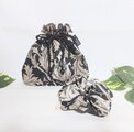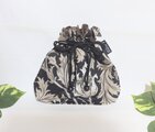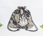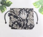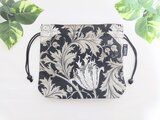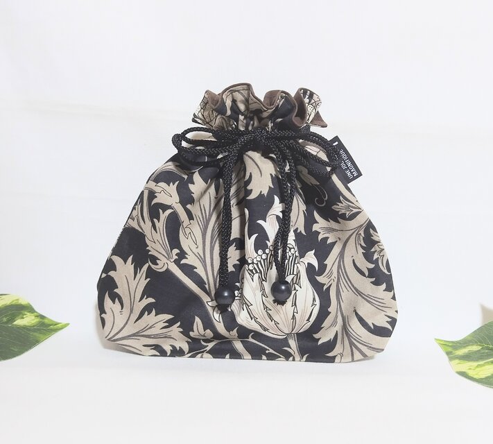 ウイリアム モリスのアネモネ柄ブラック地にアイボリーとベージュの大きなアネモネの花柄、落ち着いた色合いの綿シーチング生地の巾着袋です。