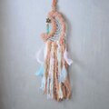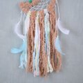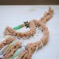ブラウンのモコモコ毛糸とグリーンやイエローのグラデーションの糸、フワフワの白い羽根の華やかなコントラストと幻想的なデザインが魅力的なドリームキャッチャーです。
