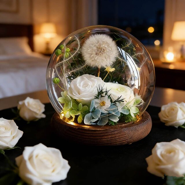 サイズは約13×13×11cm。光の効果を持つ豪華なガラスカバーが付属しているので、光を灯すと温かみが加わり、贈り物にぴったりです。ガラスカバーは埃や湿気から守り、花をより長く楽しめます。