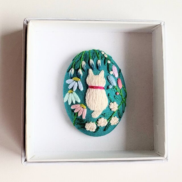 深いブルーグリーンのコットン地に子ねこと小さなお花を丁寧に刺繍しました。