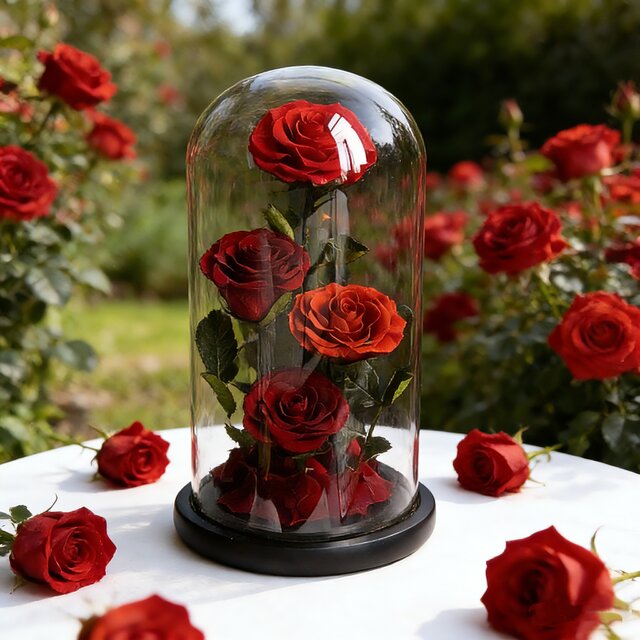 作品のサイズは約15×15×30cm。高級感のあるガラスカバーが付属しているので、どなたにも安心してお贈りいただけます。ボックスは花を埃や湿気から守り、より長く楽しめます。この作品には、さまざまな機会や相手に合わせた3つのデザインがあります。