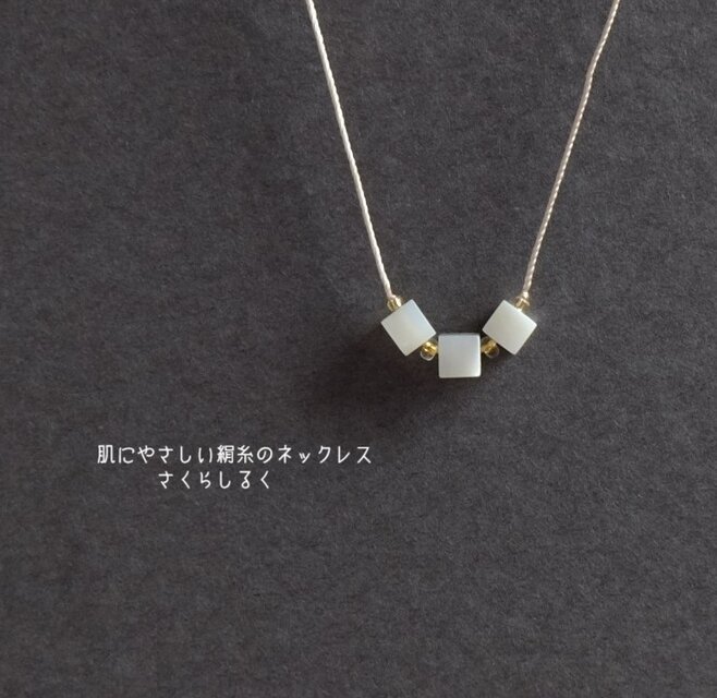 24 【天然石 マザーオブパール】キューブ 14kgf 肌にやさしい絹糸のネックレス 糸の色&長さえらべます