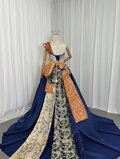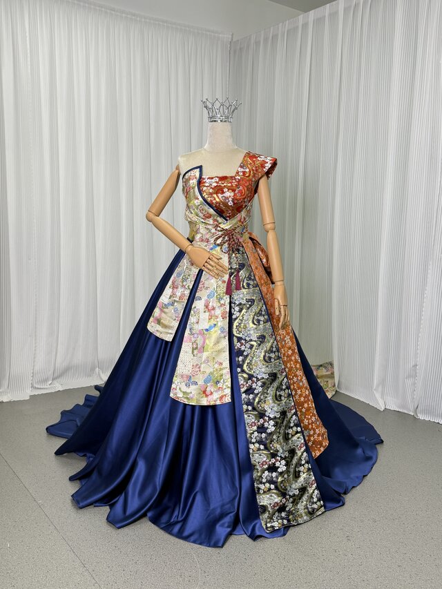 着物ドレス、和ドレス ネイビー ワンショルダー ふっくら柔らかなバックリボン ジャガード生地 編み上げ