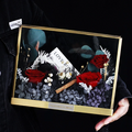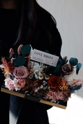 作品のサイズは約24 x 19 x 8 cmで、高級感のある透明なギフトボックスに梱包されているので、どなたにも安心してお贈りいただけます。また、ボックスは花を埃や湿気から守り、より長く保存することができます。