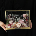 作品のサイズは約24 x 19 x 8 cmで、高級感のある透明なギフトボックスに梱包されているので、どなたにも安心してお贈りいただけます。また、ボックスは花を埃や湿気から守り、より長く保存することができます。