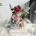 この作品は強い情熱的な感情に満ちている。高級感あふれる特大のバラが、高貴で洗練された愛を表現しています。様々なグリーンとドライフラワーで彩られたデザインは、鮮やかで爽やかです。作品のサイズは約12 x 12 x 20cmで、高級感のある透明なギフトボックスに梱包されているので、どなたにも安心してお贈りいただけます。また、ボックスは花を埃や湿気から守り、より長く保存することができます。