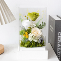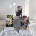 この作品は、最も純粋で情熱的な感情を表現しています。上質な特大のバラを使用し、シンプルながらも繊細な感情表現をしています。様々なグリーンとドライフラワーで彩られたデザインは、鮮やかで爽やかです。作品のサイズは約12 x 12 x 20cmで、高級感のある透明なギフトボックスに梱包されているので、どなたにも安心してお贈りいただけます。また、ボックスは花を埃や湿気から守り、より長く保存することができます。