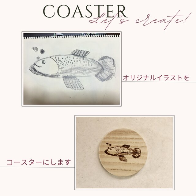 あなたやお子様、大切な人のオリジナルのイラストを桐のコースターに刻印して世界に一つだけの作品を作ります。