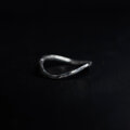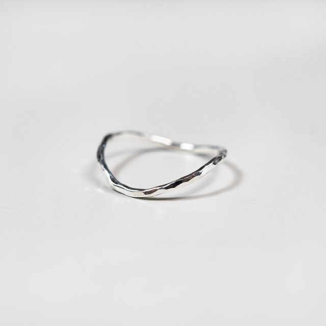 細身のリングに柔らかなウェーブラインを加えることでアクセントが生まれ、シンプルでありながら動きを感じるフォルムに仕上げています。仕上げに1点ずつ丁寧に槌目模様を打ち込み、ランダムな凹凸が繊細で味わいのある質感を生み出します。