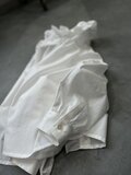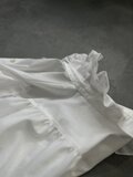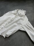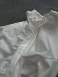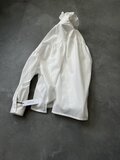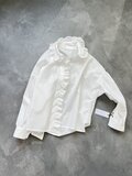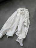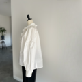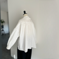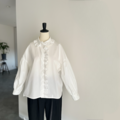 衿フリルギャザーの甘すぎないカジュアルなワイドブラウスです。シャツカラーにギャザーフリルをあしらったデザインで、前たては比翼仕立て、袖には脇にマチが入りギャザーがたっぷりと施されています。ワイドサイズが甘さを抑え、カジュアルな雰囲気を演出するこだわりの一枚です。