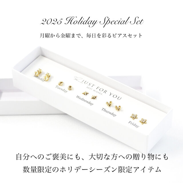 毎日を華やかに彩る、数量限定のホリデーシーズン限定ピアスセット。月曜から金曜まで、5つのデザインが楽しめる特別なコレクションです。立体ツイスト・小さなプチデザイン・星モチーフ・小花モチーフ・雪の結晶モチーフなど、どれも繊細で上品な輝きを放つデザイン。その日の気分やコーディネートに合わせて選べる、贅沢なセット内容です。