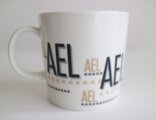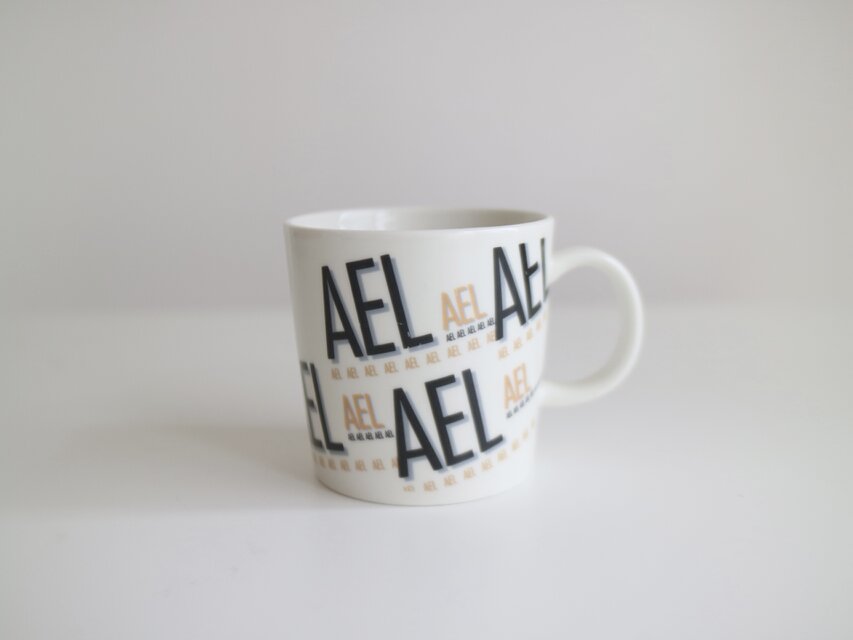 マグカップのフォルムは定番のTEEMAをベースに、カップ表面には職業訓練校の名称「AEL」が描かれており、どこかレトロで、タイポグラフィが可愛いらしデザインです。