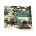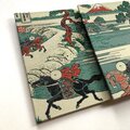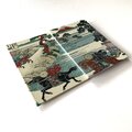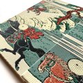 配色には北斎ブルーと称される藍を基調に、朝焼けを想起させる朱が織り交ざり、静寂の中に力強い生命の息吹を宿しています。織物としての立体感が、平面作品に内在する時間と空間の奥行きを豊かにし、江戸の名景を現代に蘇らるかの様です。伝統工芸と浮世絵美術が融合した本作は、視覚と触覚の双方で日本美の精髄を味わうことができる芸術的な一冊となりましたら幸いです。