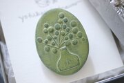 草花をモチーフに消しゴムはんこを彫り、はんこを陶土に捺しつけて凹凸の模様をつけたブローチです。