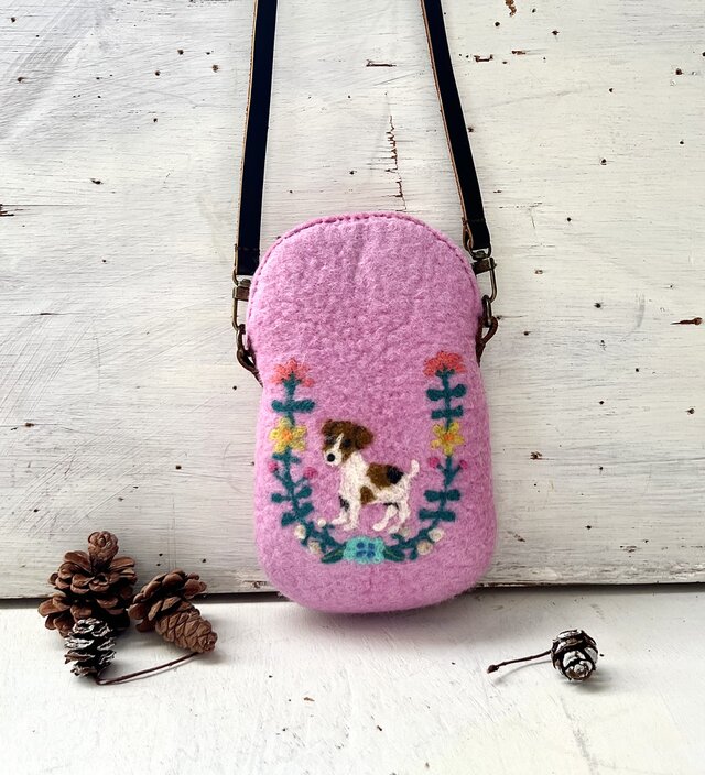 お花のリースと動物の羊毛フェルトポーチポシェット(桜✖️ジャックラッスルテリア)
