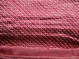 中綿を入れ、花柄の着物で作ったループを付け、ループの先に、トンボ玉と山サンゴを付けています。