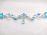 チェコビーズを沢山編み込みました。ビーズの透明感を引き立たせるためにテグスを使用し、二重に通すことで強度を上げています。ガラスビーズのしっとりとした重みがあります。陽の光のもとと、室内光では目立つ色味が少し変わります。