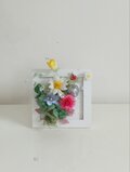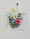四つ葉のクローバー、三つ葉、マーガレット、薔薇、すみれ、小花、コーンサラド、オオベニチョウラン、りんご装飾などで、可愛いフレーム装飾に仕上げました。