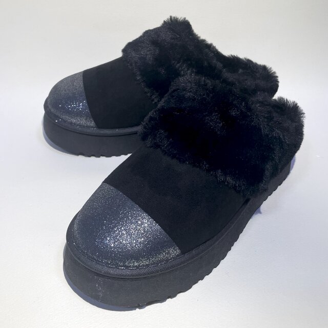モコモコで暖かいボア厚底サボサンダル (ブラック x ブラックラメ) ムートンブーツ風サボ・S〜LLサイズ