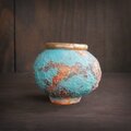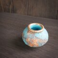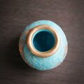 風化した様に仕上げた粗いテクスチャーを口の金彩が引き締めます。大地の様な土と空色は草花に自然に寄り添います。