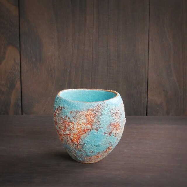 風化した様に仕上げた粗いテクスチャーを口の金彩が引き締めます。大地の様な土と空色は草花に自然に寄り添います。