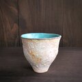 風化した様に仕上げた粗いテクスチャーを口の金彩が引き締めます。砂糖衣の様な白色と内側から覗く空色は草花に自然に寄り添います。