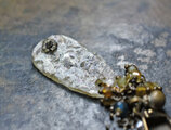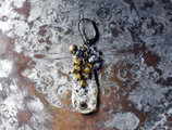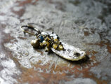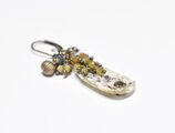 アースカラー銀化のローマングラスとたわわなストーンビーズ、インディゴブルービーズ、民族鈴を繋いだ片耳ピアスです。
