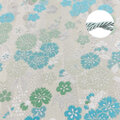 アイボリーを基調に、白や水色、グリーンの花々が瑞々しく織り出され、明るく柔らかな印象に仕上がっています。