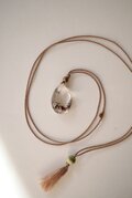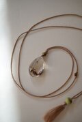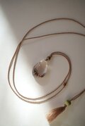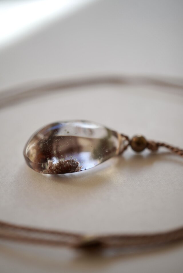 透明度が高く落ち着いた配色のガーデンクォーツをドイツ製絹糸で仕上げております。一日中身に付けていられる肌に優しいお守りペンダントです。