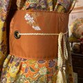 付属の帯ベルトは錆朱×金糸。片面は花、片面は流れる草葉文で、結ぶだけで全体をきゅっと引き締め、タッセルがクラシカルに揺れます。ベージュのベレーやゴールド小物とも相性抜群。
