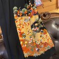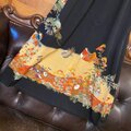 山吹〜金のぼかしと穏やかな流水文が広がり、寄り添うおしどりが物語を紡ぎます。周囲を彩る梅・菊・草花は、緋色・橙・翡翠・若草・藍・白の多彩な重なり。ところどころの金彩がきらりと光を拾い、歩くたび水面の揺らぎのように表情が変わります。遠目はシック、近くで見るほど色の奥行きと筆致の細やかさが際立つ、クラシックモードな一着です。
